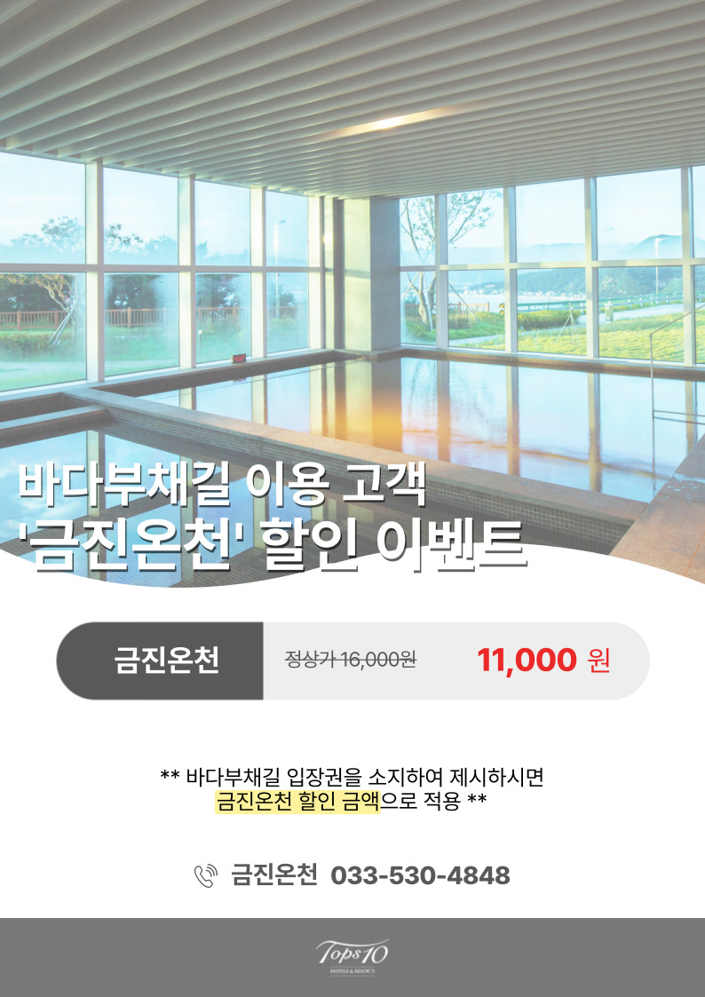 호텔탑스텐 ㅣ 강원특별자치도 강릉시 옥계면 헌화로 455-34 TEL : 033-530-4800 ㅣ FAX :033-530-4779 | E-mail : hoteltops10@gmail.com 사업자 등록번호 760-86-03592 ㅣ통신판매번호 제2018-강원강릉-0223호ㅣ대표이사 고용재 © 2019 TOPS 10 HOTELS & RESORTS All rights reserved
