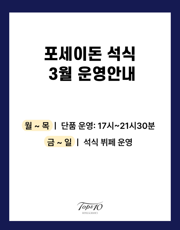 * 석식뷔페는 예약제로 운영되오니 이용 전 전화예약을 부탁드립니다. * 투숙객, 강원도민 10% 할인. * 소인 : 37개월 ~ 초등학생 * 3월은 평일(월~목) 단품으로 운영됩니다. | |||